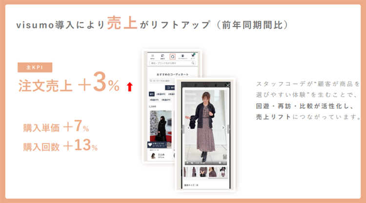 また、visumo導入により前年同期間比で注文売上が3%リフトアップし、購入単価+7%、購入回数+13%という売上リフトアップの成果も出ました。