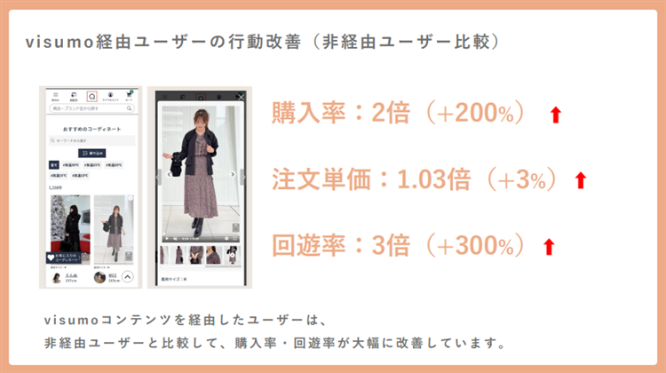 visumoコンテンツを経由したユーザーは、非経由ユーザーと比較して、 購入率2倍(+200%)、回遊率3倍(+300%)、注文単価1.03倍(+0.3%)という大きな行動改善が見られました。