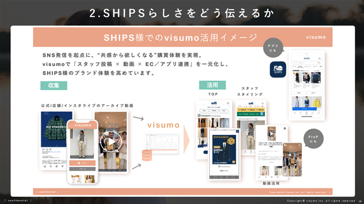スタッフ投稿をはじめ、Instagramに掲載している公式投稿やInstagramライブのアーカイブ配信等の動画コンテンツは、すべて『visumo』へ集約しています。これらのコンテンツを、シームレスにECサイトや公式アプリなどに掲載することで、SNSとECの連携を行い、SHIPSの目指す一貫した顧客体験を後押ししています。